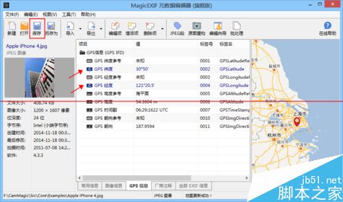 3、同理双击“GPS 经度”可以修改照片的GPS经度数据,完成编辑后可以看到被编辑的项目变成蓝色,而且右侧的地图也被更新了。点击工具栏的“保存”按钮保存对照片的编辑。