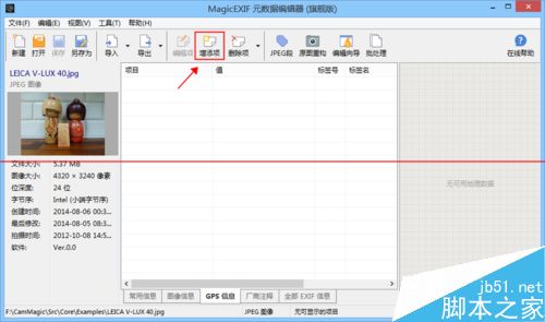 1、运行“MagicEXIF元数据编辑器”软件,点击大眼睛下面的“打开文件”按钮或工具栏的“打开”图标打开一张照片图片。