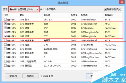 2、在“显示”下拉列表中选择“GPS地理信息”,主要勾选下图中的四项数据,其他项目可以酌情添加,点击“确认添加”应用。