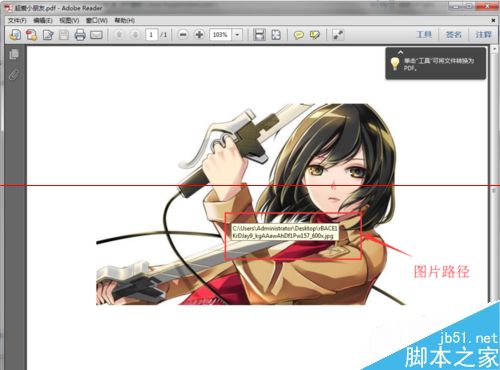 1、如图,用Adobe Reader打开pdf,能够看到图片的原路径,如何设置能够避免显示图片路径呢?一个自欺欺人的方法,就是用其他pdf阅读器打开,我用极速阅读器打开就没问题。