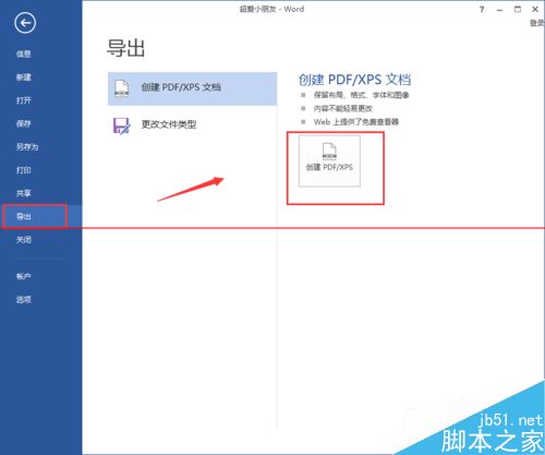 2、【文件】菜单里,有一项名为【导出】,点击【导出】,右侧可以看到【创建PDF/XPS文档】,点击该按钮