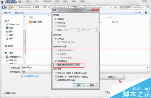 2、彻底解决的方法,在导出pdf的时候,如图窗口,点击【选项】,取消勾选“辅助功能文档结构标记”,保存后再发布,这样就不会出现图片路径了。