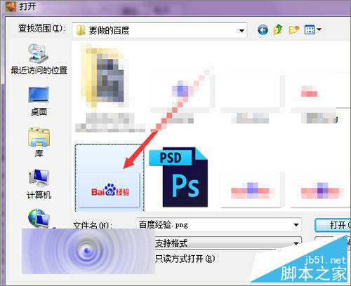 7、接着在打开的文件夹中选择一个文字或者其它的图片都是可以的。这里就选择百度经验的logo图片。点击打开。