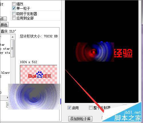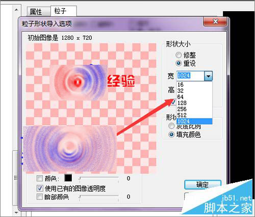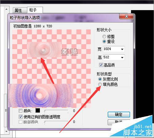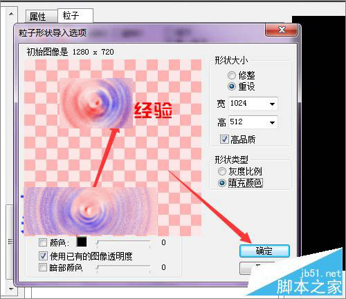 8、当点击打开百度经验的图片之后,可以看到在这个粒子形状导入的选项中,它的图片显示的是灰色的,并不是我们之前导入的颜色。这里还要把它进行一个选择。在形状类型中它默认的是灰度比例。需要把它改为直译颜色。点击确定。