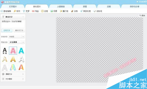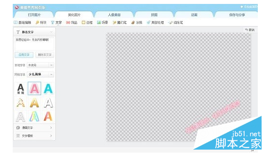 第四步:以上你都完成后,你将得到一张灰色的画布。这时,你需要点击工具条上的“文字”,进入文字编辑界面,输入你要加的水印文字。嘟嘟加的是“百度经验ID:无名氏粉嘟嘟”。在这个界面,你可以选择字体颜色、透明度、特效、旋转度等,看自己喜欢了。