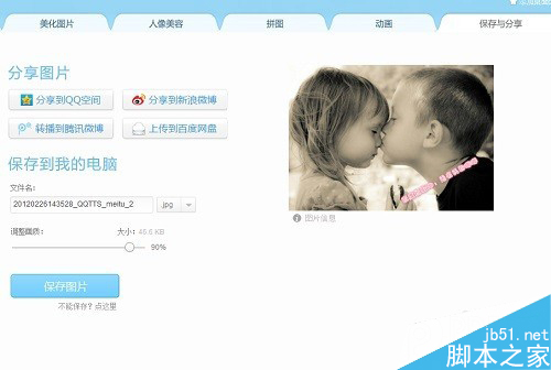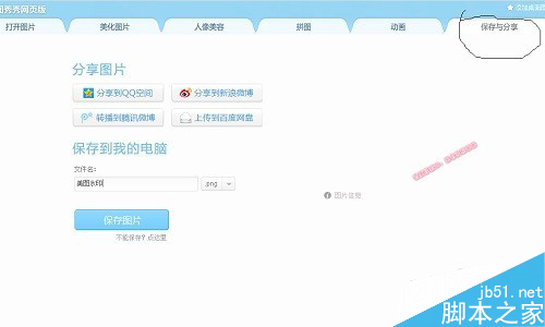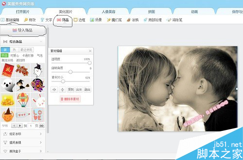 第七步:打开图片后,点击“饰品”—“导入饰品”,导入你之前制作的水印,调整至合适的位置后,点击“保持和分享”完成加水印全过程。