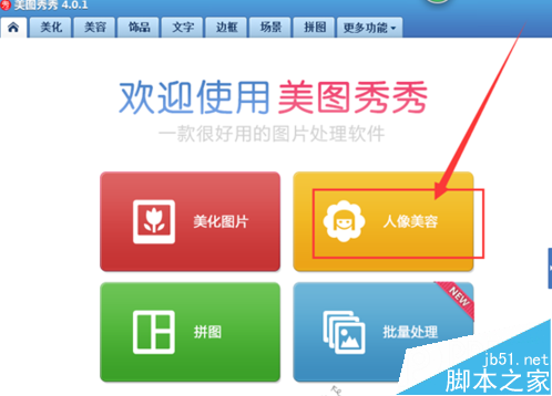 2、在我们进入美图秀秀后,我们可以到该界面分为四大板块,我们这里选定人像板块点击打开。