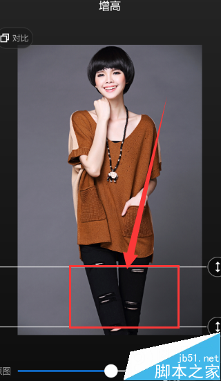 6、看到默认增高的位置不合适,接下来我们就移动增高位置,移动到腿的位置,点击下面的增高按钮之后,我们看到我们美女的腿长了。