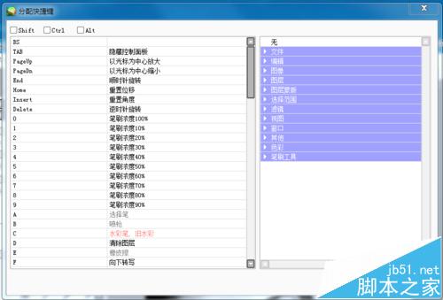6、这只是一个简单的例子,在设置快捷键之前,你不妨先了解一下快捷键设置右侧的功能菜单,然后把最常用的功能关联到顺手的快捷键上。