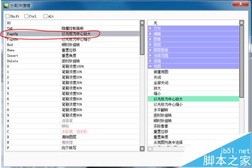 3、比如你要将“Shift+Alt+PageUp”设置为画面放大功能,你需要这么做;首先在按键列表中选中PageUp,先不用管右侧的功能菜单。