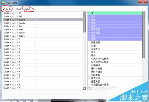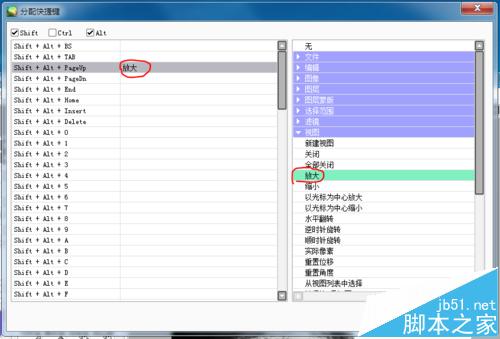 5、最后要做的就是在右侧的功能菜单中找到"放大",左边点一下就可以把这个功能关联为Shift+Alt+PageUp快捷键了。设置完毕点击确定就可以保存。