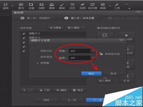 4、图片将会进入所选示的界面中,然后点击“下一步”。随后点击右侧的“调整尺寸”,一般我们按照图片的宽*高进行调整,如需要的图片是600*450,那么我们将设置成宽600,高450,然后点击确定。