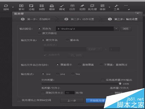 5、在上步“确定”的基础上,我们进入下一步,将处理后的图片存放在自己想要存放的位置,可选择放在桌面,若不放置在桌面,可点击“浏览”存放在需要的盘内,然后直接点击“开始批量处理”。