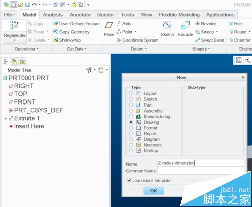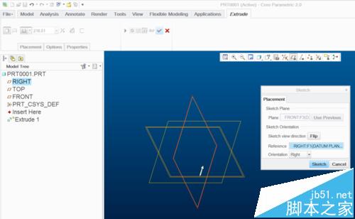 1、在Creo中建立一零件图,选Front为草绘面,Right为参考面