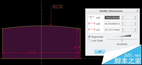 2、单击“草绘”按钮,进入草绘绘图环境,绘制如图中所示带大圆弧的封闭草绘截面;修改截面尺寸为需要值