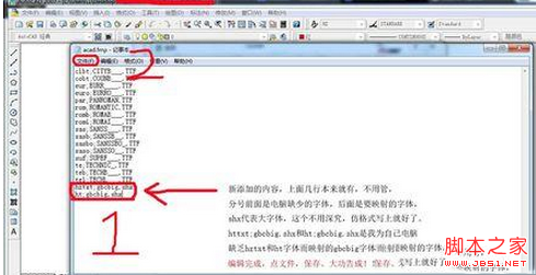 注意事项:用记事本打开acad.fmp文件后, 字体映射httxt;gbcbig.shx和ht;gbcbig.shx的编辑要在英文状态下编辑,分好和句号是英文中的。