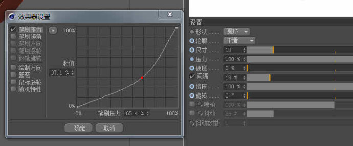 在工具栏中点击“笔刷”工具,在笔刷设置中点击“压力”前的小圈, 在弹出的“效果器设置”中勾选“笔刷压力”,右侧的曲线可以对笔刷压感进行微调,横轴表示输入压力,纵轴表示输出效果图中所示曲线会降低笔刷的压力(也就是说要画出同等的效果需要用到更大的力气,但是如果用到一定程度力气,也会画出满压力的效果)