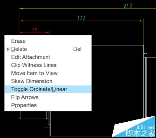 6、选择尺寸“122”,在弹出的菜单中选择“Toggle Ordinate/Linear”,然后选择尺寸“30”,而不选“WitnsLine”,即可生成“122”的坐标尺寸