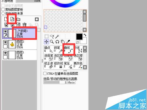 5、之前的设置好之后,点击新建钢笔图层。记住是新建钢笔图层!这时就会出现一个新的与下面两个不同的图层。然后选择旁边的”曲线“,因为这张图勾勒起来使用这个笔比较好,如果直线多的还可以选择”折线“等。