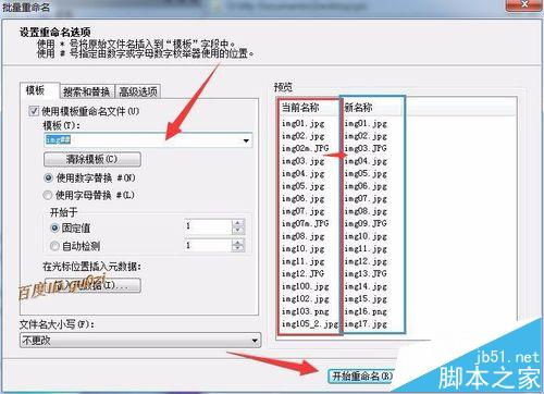 3、在 批量重命名 对话框中,先对选项下的模板进行修改,比如说模板设置为img##,这里## 代表两个数的数字序列,如果10以内的话,就会自动加个零.设置好后点击 开始重命名就可以改名了.