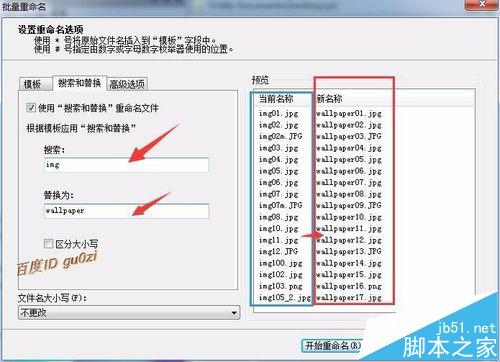 4、对文件名中的特定字符串进行修改,可以在搜索和替换中,比如说把当前名称中的img,改为wallpaper,点击 开始重命名就可以改名了.