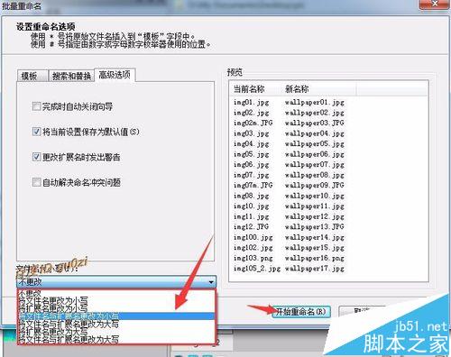 5、对文件名的大小写进行修改的方法,可在 文件名大小写 下方的选择框中选择后,点击 开始重命名 来进行.