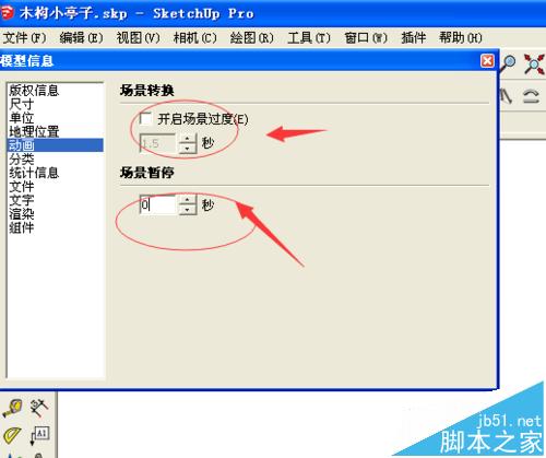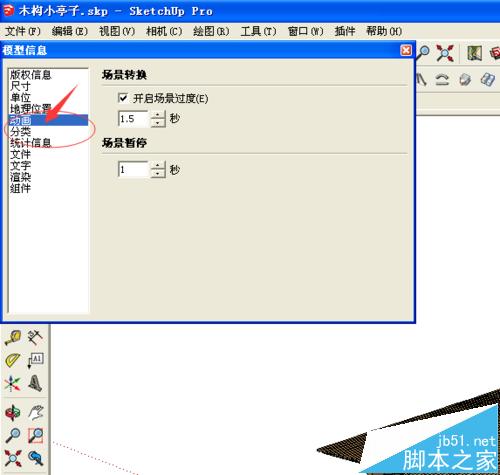 3、到“窗口-模型信息-动画”中设置,允许页面过渡不选,场景延时选0秒。如图