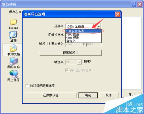 5、再在选项中选择分辨率,我一般选1080,也可以自己设置,选自定义。
