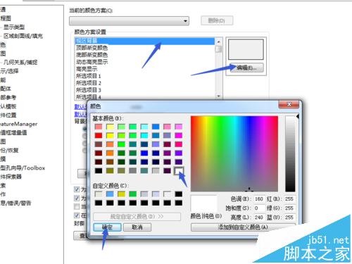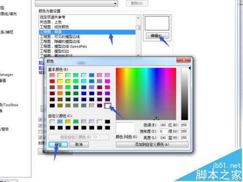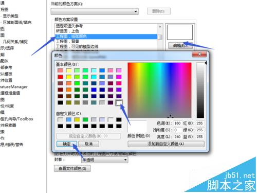 5、调整纸张颜色。如图所示,选择工程图,纸张颜色,点击右侧编辑,在弹出的颜色对话框中选择白色,并点击确定命令。