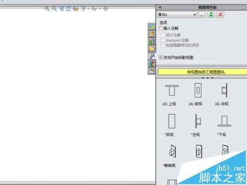5、进入工程图。点击确定后会进入工程图界面,在右侧会出现各个视图的界面,此时只需要将自己需要的视图,用鼠标左键点住,拖到中间的图纸界面就可以。