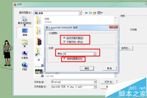 2、导入su时,请在选项处设置好单位,平面方向,原点