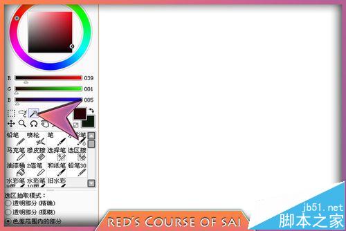 1、SAI里的魔棒工具用于快速建立选区,魔棒工具按钮位于色轮的下方。