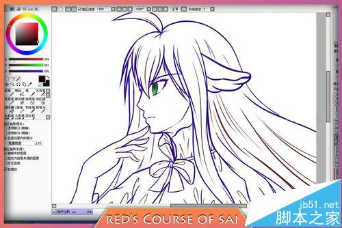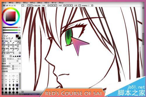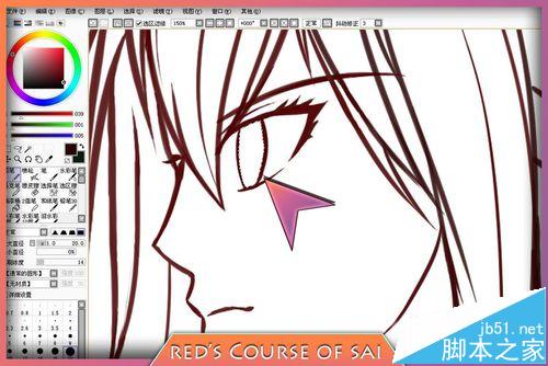 6、魔棒工具是根据色差范围来建立选区的,眼睛之所以能被选中,是因为这时的眼睛里面全是白色,轮廓线是深红色,那么魔棒理所当然会把白色区域作为选区,要是我点中眼睛的轮廓线,那么魔棒会把线稿中它判定颜色相近并且相连的部分作为选区。
