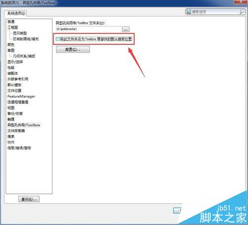 3、取消“将此文件夹设为Toolbox零部件的默认搜索位置”前的勾选