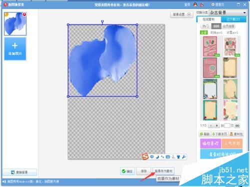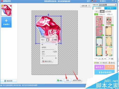 6、进行手动抠图。最后要对抠好的图进行“描边”(白色,粗细自己定),选择“阴影”,进行“羽化”。然后保存,选“前景保存为素材”与“保存”图片,注意保存图片格式要为“png“格式,这样保存的图片是透明的,即无背景。
