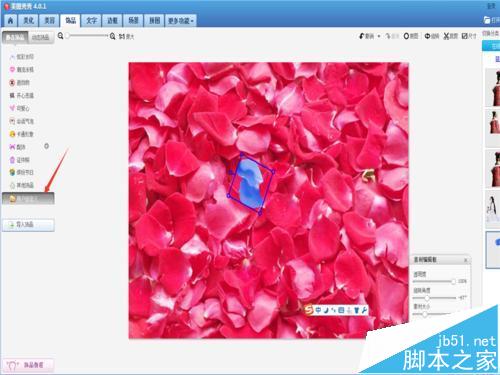 4、打开红色花瓣图片,点击右键,“插入一张图片”,在“饰品”的“用户自定义”下,找到蓝色花瓣并插入,调整好角度与大小。