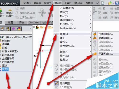 1、如图所示:选择草图,点击“插入”——“曲面”——“平面区域”。然后可以看到草图区域已经变成灰色的平面区域了。