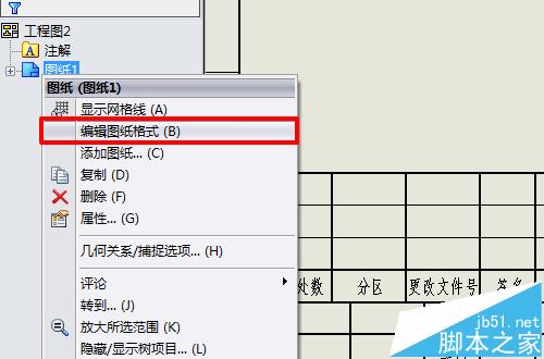 3、添加文字的话我们只要“编辑图纸格式”就行了。方法有两种:一是左边在“图纸”上右击选择“编辑图纸格式”;二是直接在右边图纸界面上右击选“编辑图纸格式”,如下图。