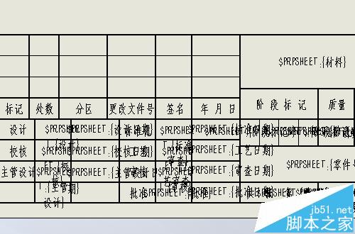 4、进入编辑图纸模式后,下方的空格处会出现很多乱码一样的东西,这些其实是链接到某种属性的代码。比如材料栏,当你建模的时候设置了某种材料,那么导入工程图的时候就会自动显示那种材料了。