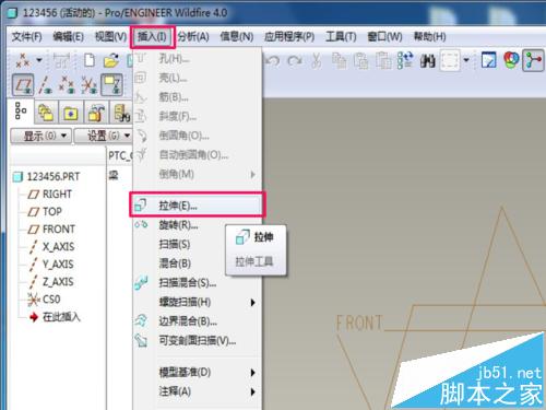 2、打开插入菜单,里面有建模的不同方法,选择拉伸。拉伸是用的最多的,也是做简单的。