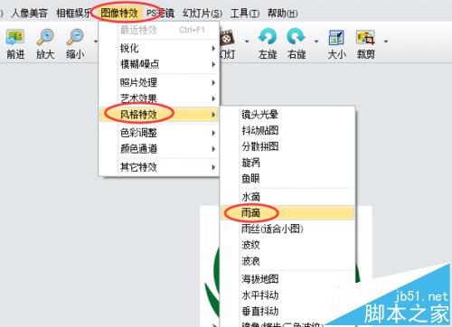 3、先设置风格特效,单击图像特效---风格特效,选择雨滴特效。