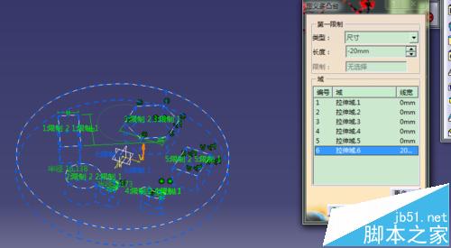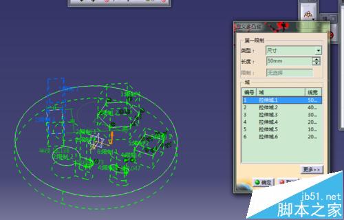 5、选择多凸台命令。对每个图形经行拉伸;从拉伸域1开始一次为50、40、30、20、10,然后拉伸域6为-20;点击确定。得到多凸台实体;