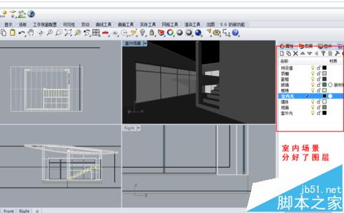 1、首先打开一个rhino场景,这是一个很简单的室内场景,有两面玻璃进行采光,在建模时已经分好了图层。