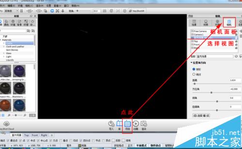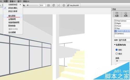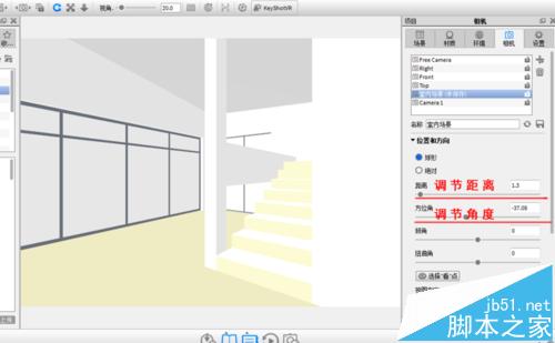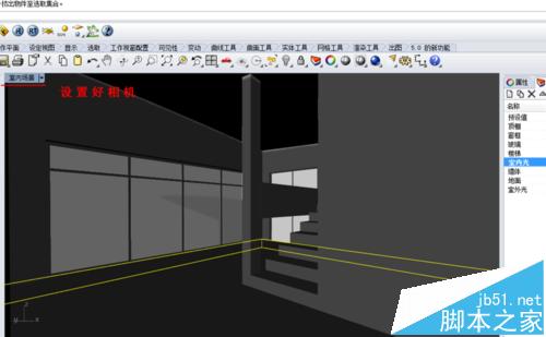 6、在相机设置中调节距离,调节角度,显示室内场景。如果在视图中一片漆黑无法显示,请先关闭细化阴影。