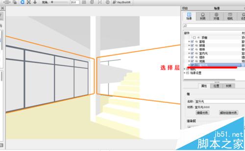 2、注意场景中,在室外放置了两个平面作为室外光,并放置在室外光图层,室内也创建了一个平面作为室内光,放置在室内光层。大家可以调节面的角度,因为只是思路,这里没做调节,只是放置了平面。