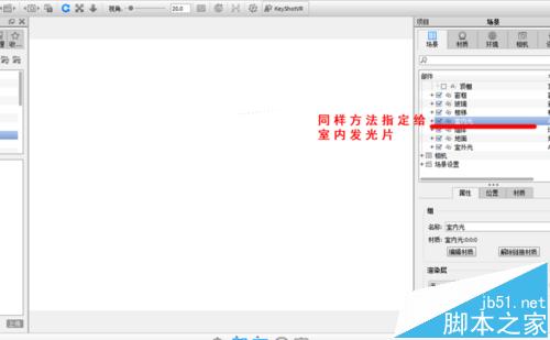 7、关键一步,进入场景面板,为室内发光和室外发光指定发光材质。