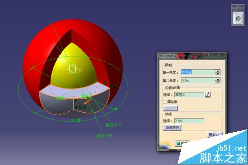 4、选择YZ平面,进入草图,绘制一组同心圆,直径分别人100,和150,然后修剪成1/4圆,图示图形,退出草图,进行旋转,角度为90度,旋转轴为Z轴,然后添加颜色;