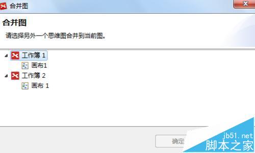 3、将会出现合并图选项窗口,在其中按工作簿展现了所有打开的导图。选择你想要进行合并的导图,导图将会合并到当前所在导图中。
