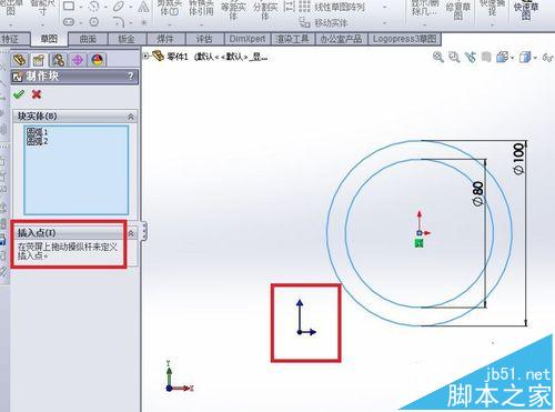 6、单击“插入点”并拖动蓝色坐标系到合适位置,作为插入时的基准点,完成后单击对号按钮,并退出草图。