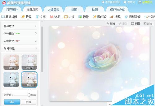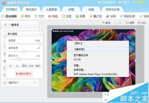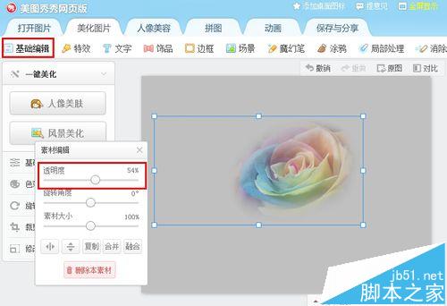 5、回到“基础编辑”,选中花朵,在浮出的面板中将花朵的透明度调低一点。